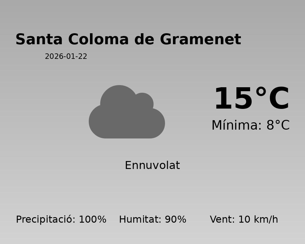 Bon dia als habitants de Santa Coloma de Gramenet. Avui, el temps serà predominantment humit i amb alt risc de precipitacions. És important planificar amb cura les activitats a l’aire lliure i estar preparat per a possibles pluges intenses.