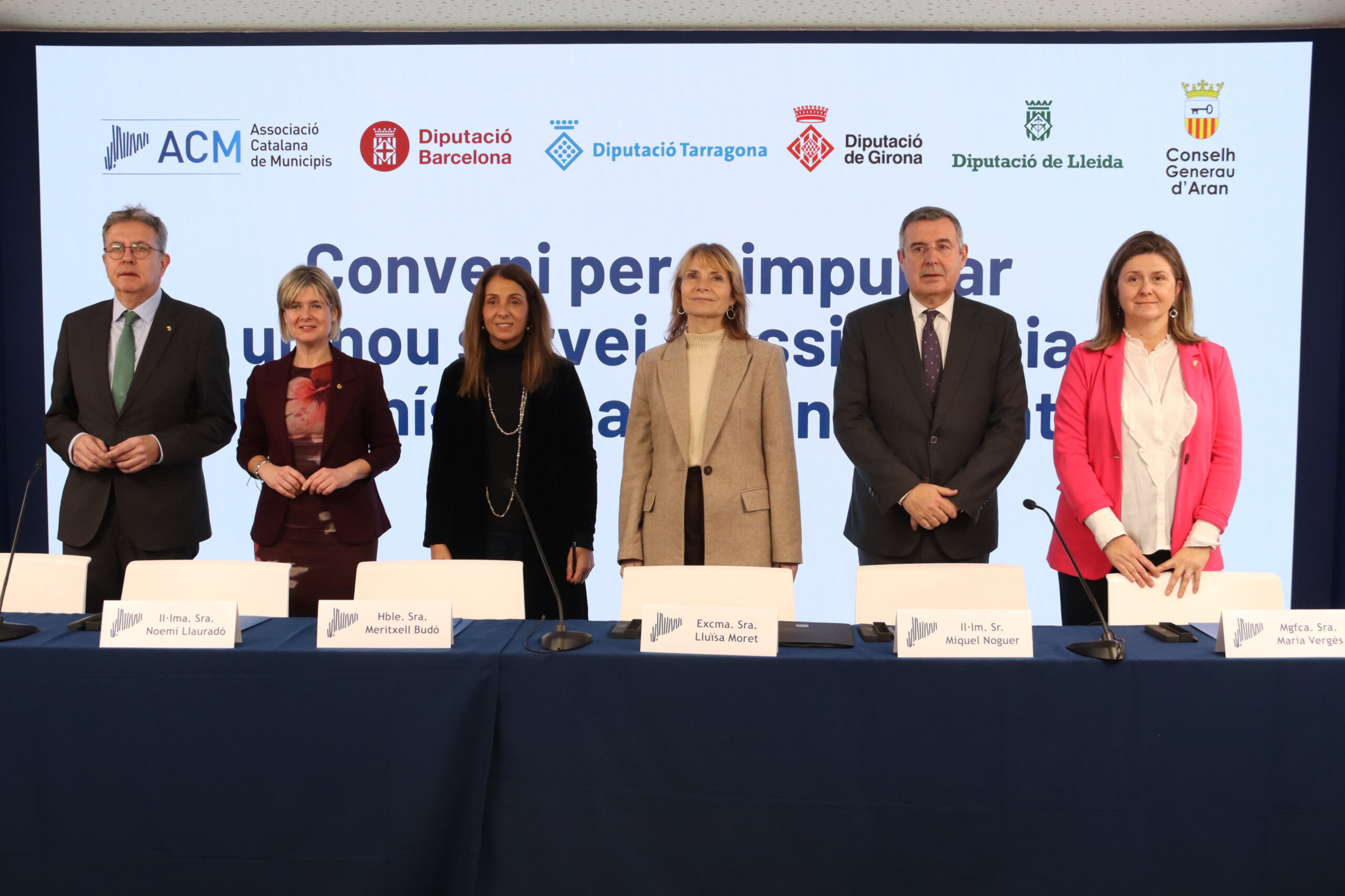 A la signatura del conveni hi ha assistit Budó, la presidenta de la Diputació de Barcelona, Lluïsa Moret, la de Tarragona, Noemí Llauradó, i els presidents de les diputacions de Lleida i Girona, Joan Talarn i Miquel Noguer, així com la síndica del Conselh Generau d’Aran, Maria Vergés.