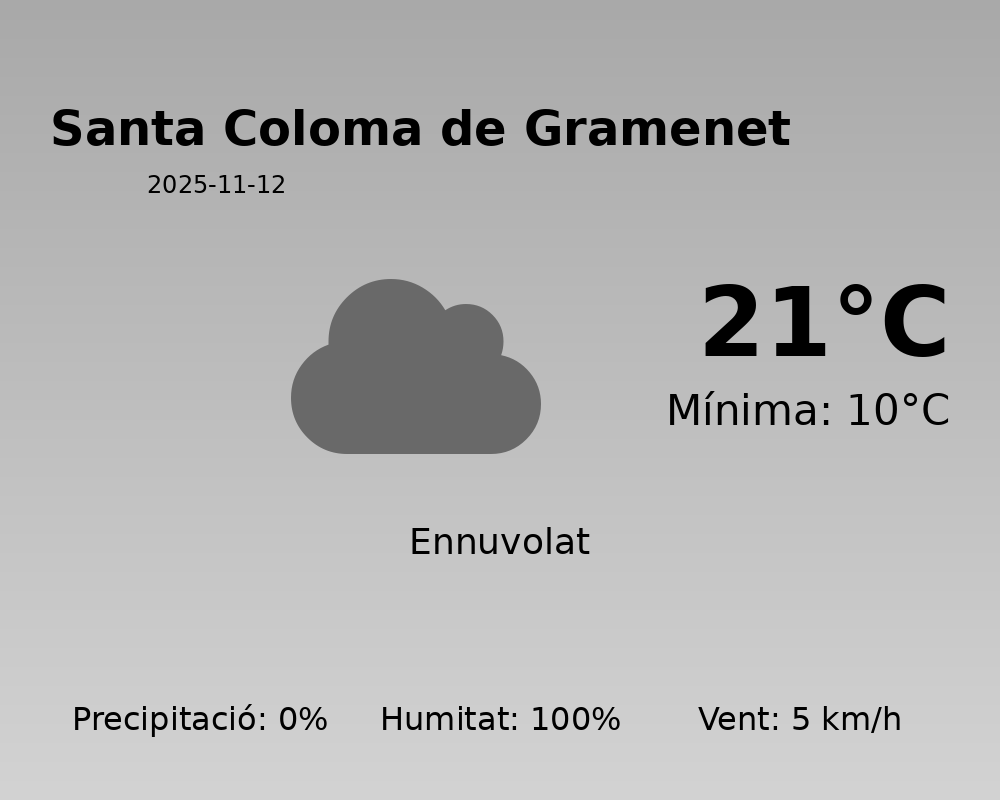 Avui, el temps a Santa Coloma de Gramenet serà predominantment estable amb una temperatura màxima prevista de 21°C i una mínima de 10°C. Aquestes temperatures indiquen un dia suau, ideal per a activitats a l’aire lliure.