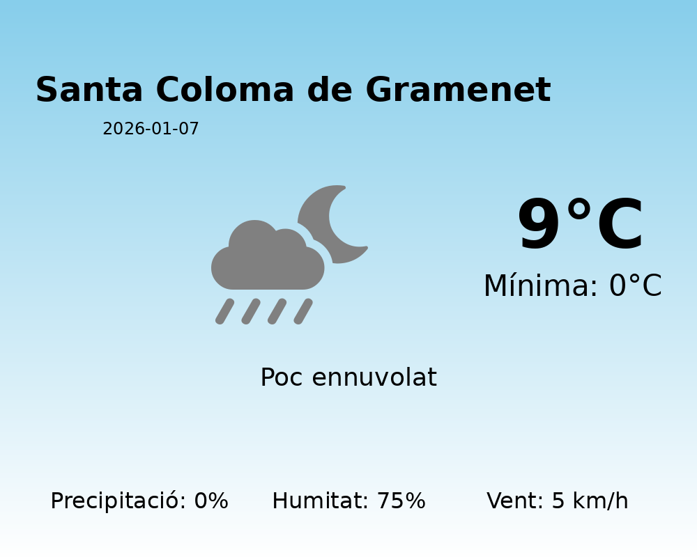 Bon dia a tothom! Avui la meteorologia es presenta amb una barreja d’elements que cal tenir en compte abans de sortir de casa. La jornada a Santa Coloma de Gramenet estarà marcada per temperatures relativament baixes i una humitat moderada.